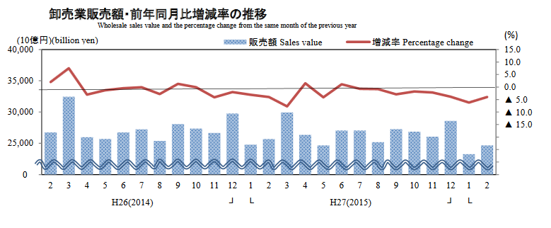 2月の商業販売額は35兆4360億円となり、前年同月比▲2.7%だった。ただし季節調整済では0.3%のプラスとなった。「商業」とは「卸売業」と「小売業」を合わせた業種のことである。