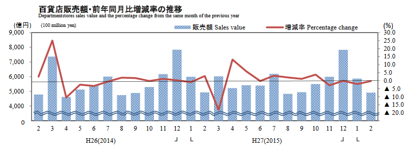 日本百貨店協会から発表された2月の百貨店の業績をみると、既存店売上高は4446億7431万円、前年同月比プラス0.2%となり2カ月ぶりのプラスとなった。 降水量がかなり多かったというマイナス要因も払拭し、温暖な気候と、うるう年による1日多い営業日が客足を伸ばした結果、プラスとなった。