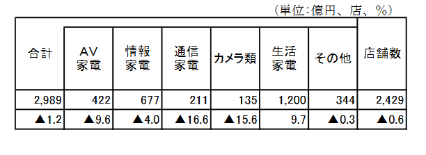 一方他はすべてマイナスとなり、通信家電▲16.6%、カメラ類▲15.6%、AV家電▲9.6%、
