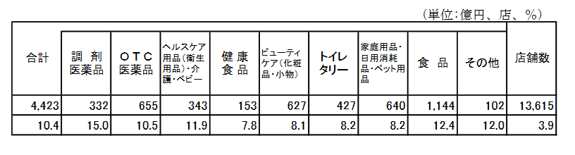 商品別では、調剤医薬品15.0%、食品12.4%、その他12.0%、