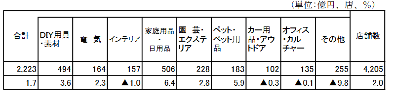 一方マイナスは、その他▲9.8%、インテリア▲1.0%、カー用品・アウトドア▲0.3%、