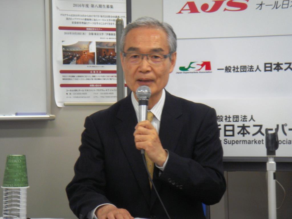 今月の発表担当はオール日本スーパーマーケット協会の松本光雄専務理事。