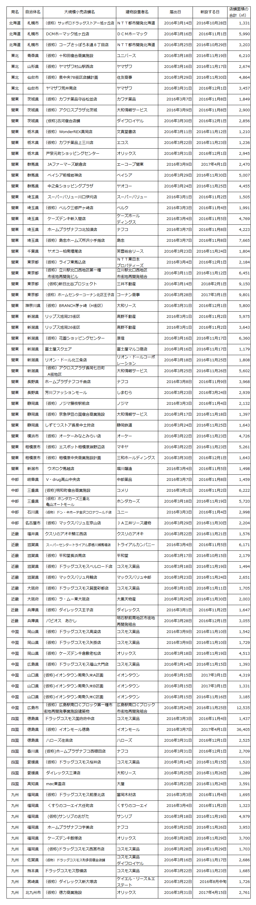 店舗数では3月も、コスモス薬品の出店数が多く、1月の9店、2月6店に続き、3月も10店の申請をしている。また、他にもくすりのアオキ、中部薬品、くすりのコーエイなどが申請しており、ドラッグストアは続々と誕生する。