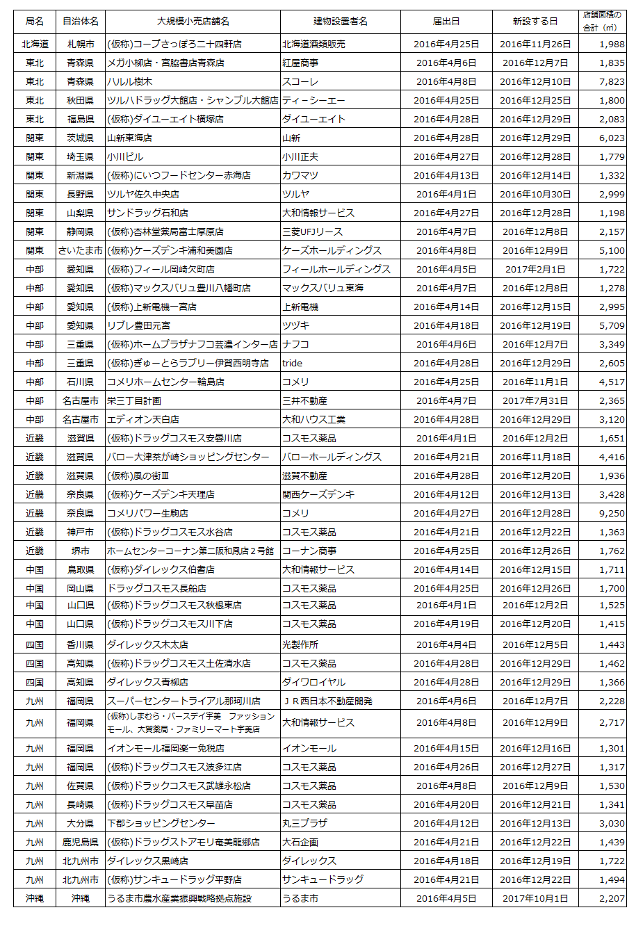⇒大規模小売店舗立地法 (新設)届出の概要 【2016年4月末】