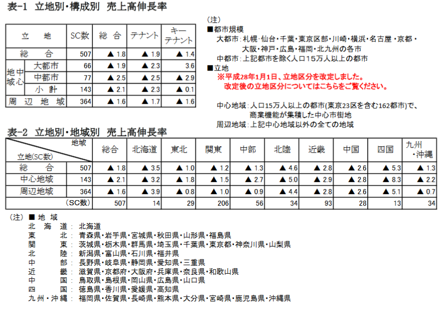 立地別・構成別の下記表を見ると、キーテナントの大都市が唯一プラス3.6%となっているが、他はすべてマイナス。(表-1参照)