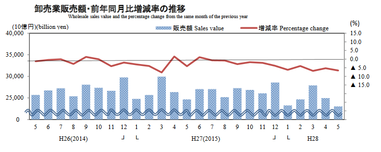 5月の「卸売業」と「小売業」を合わせた商業販売額は34兆5790億円となり、前年同月比▲5.1%。季節調整済も▲2.4%という結果だった。