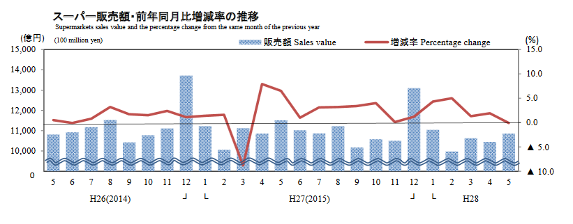 そして一般社団法人日本スーパーマーケット協会、オール日本スーパーマーケット協会、一般社団法人新日本スーパーマーケット協会の合同調査である「スーパー マーケット販売統計調査5月実績」によると、全店総売上高は8929億3245万円、 既存店前年同月比はマイナス0.2%となり、1年2カ月ぶりにわずかにマイナスに転じたと発表された。