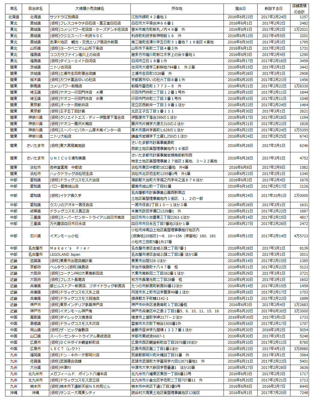 ⇒大規模小売店舗立地法 (新設)届出の概要 【2016年6月末】