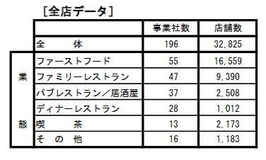 有効回収の事業社数は196社で店舗数は3万2825店。日本の外食産業はおよそ50万軒存在するといわれる。そして1年に約5万軒が閉鎖され、新たに約5万軒が新設される。新陳代謝の激しい産業だ。その中のJFに加盟する3万2825店の統計。これらはすぐに閉鎖されることのない確かな店舗群のデータと見ることができる。