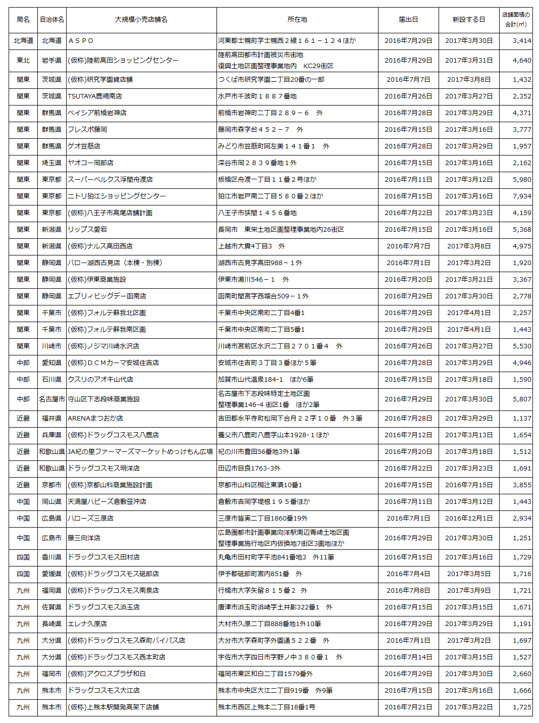 ⇒大規模小売店舗立地法 (新設)届出の概要 【2016年7月末】