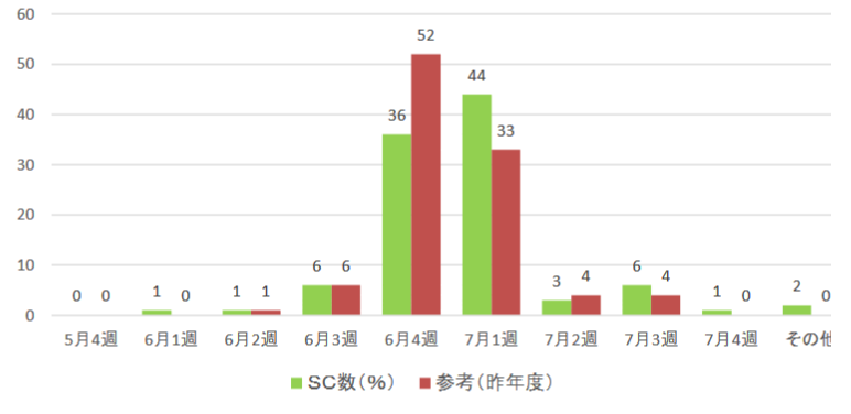 セール開始時期は、7月第1週の週末に集中し44%。とくに7月1日(金)が全体の40%で最多となった。次いで6月4週が36%と続いた。昨年は52%のSCが6月第4週に開始していたが、今年は7月1週に開始したSCが多く、昨年33%だったのに比べ11ポイント増となり、早仕掛けから実需主導へ流れが変わった。