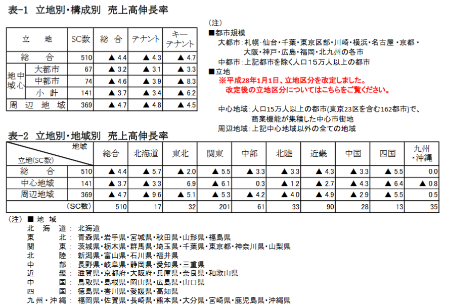 立地別・構成別の下記表を見ると、すべてマイナス。中都市のキーテナントは▲8.3%ととくに不調に終わった。(表-1参照)