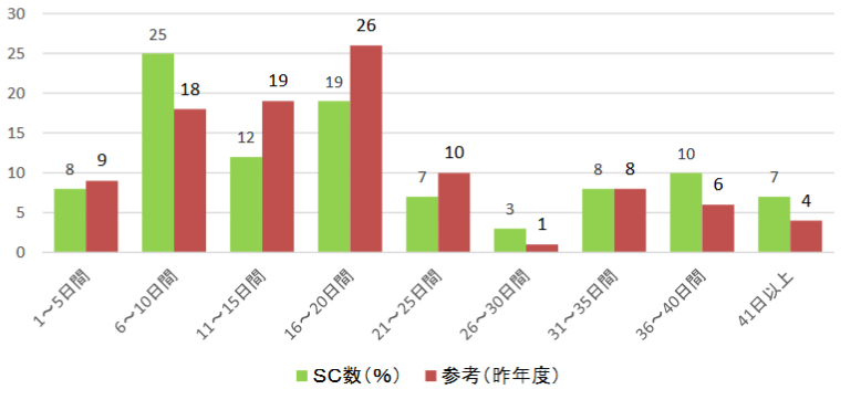 ・セール実施期間は6日~10日間が25%と最多だった。次に16日~20日間が19%と続く。中には41日以上の長いセールを実施していたSCも7%あった。