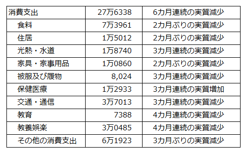 また住居等を除く消費支出で見ると、1世帯当たり24万3832円。前年同月比では実質3.1%の減少、前月比(季節調整値)は実質2.3%の減少。名目でも3.6%の減少となった。