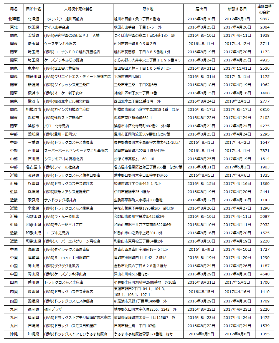 ⇒大規模小売店舗立地法 (新設)届出の概要【2016年8月末】