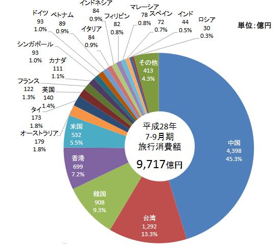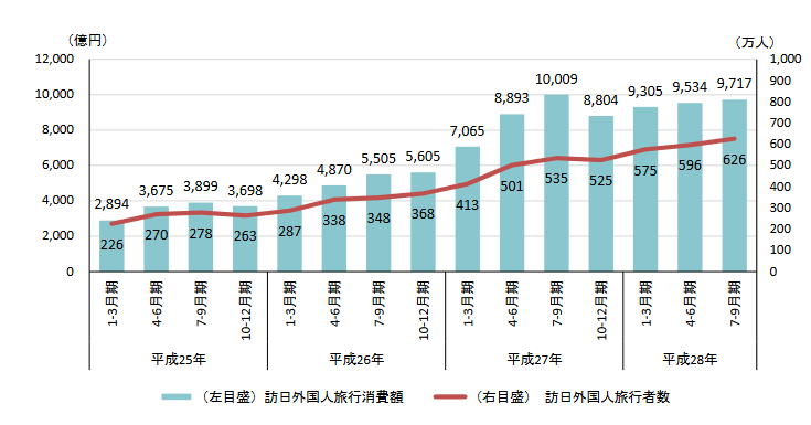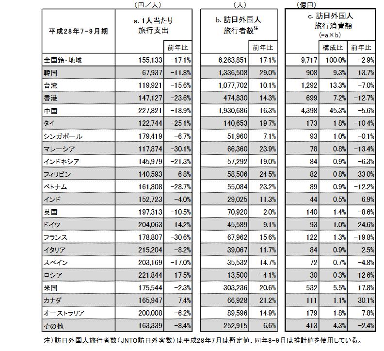 一方、観光庁は10月19日、7~9月の訪日外国人旅行者数は626万人で、前年同期の535万人に対し17.1%増加。ただし消費額は9717億円で、前年同期比2.9%のマイナスだったと発表した。