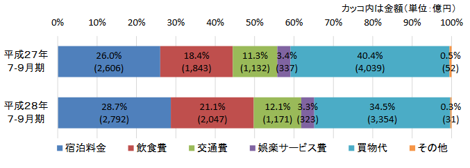 旅行消費額の費目別構成比を見ると、買物代がもっとも多く34.5%、次いで宿泊料金28.7%、飲食費21.1%となっている。前年同期に比べ宿泊料金や飲食費、交通費の構成比が拡大し、買物代の構成比が縮小した。
