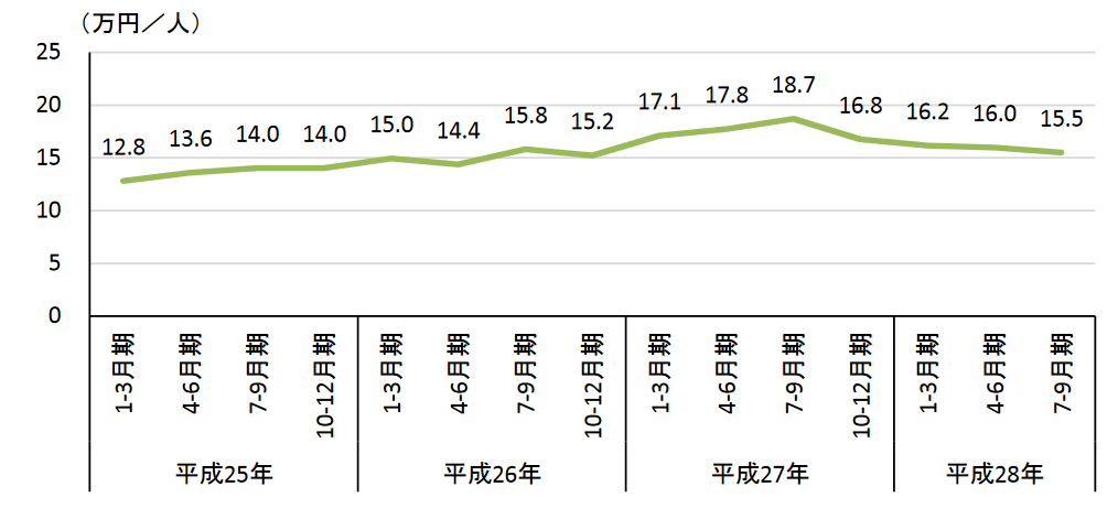 訪日外国人1人当たりの旅行支出額は15万5133円で、前年同期18万7166円に比べ17.1%減少した。