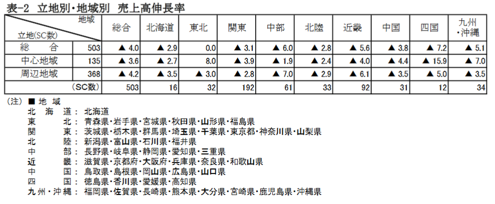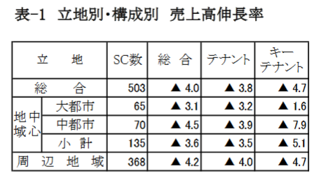 立地別・構成別の下記表を見ると、すべてマイナス。中心地域の合計は▲3.6%(大都市▲3.1%、中都市▲4.5%)、そして周辺地域は▲4.2%となった。(表-1参照)