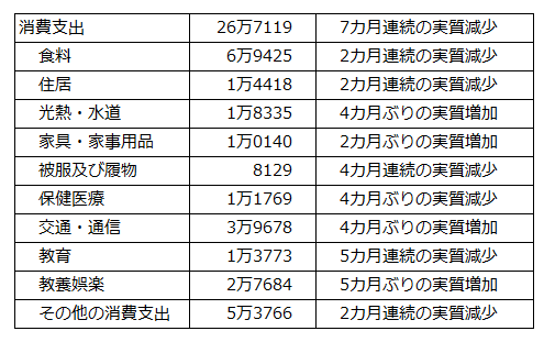 9月の二人以上の世帯の消費支出は26万7119円で7カ月連続の減少である。