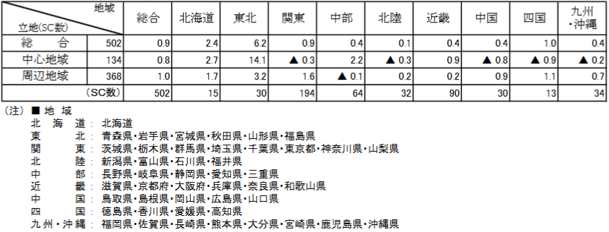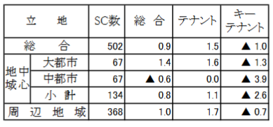 立地別・構成別の下記表を見ると、テナントはプラス、キーテナントはマイナスと明暗が分かれた。総合で唯一マイナスとなっている中都市では、キーテナントに百貨店を持つ地方のショッピングセンターの不振が目立った。また、好調業種はテナントは飲食とサービス、キーテナントは生鮮食品。一方婦人衣料はいまだ不調が続いているが、下旬からの気温低下により少し回復したとの回答もあった。(表-1参照)