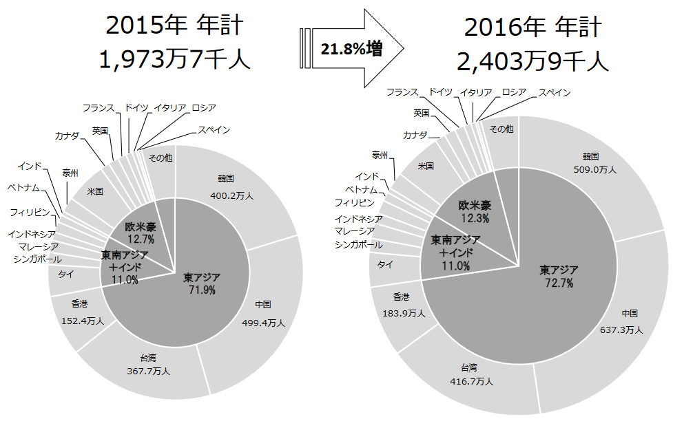 2016年の訪日外客数は前年比21.8%増の2403万9000人で、統計を取り始めた1964年以降、最多の訪日者数となった。日本政府観光局(JNTO)が1月17日に発表した。