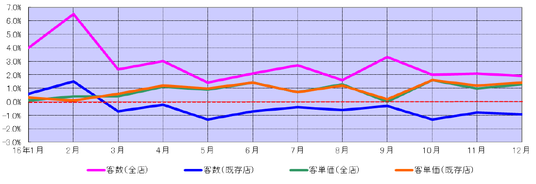 既存店ベースでは605.6円、全店ベースでは614.4円、ともに昨対0.9%増。客単価のアップが、来店客数減をカバーしている。