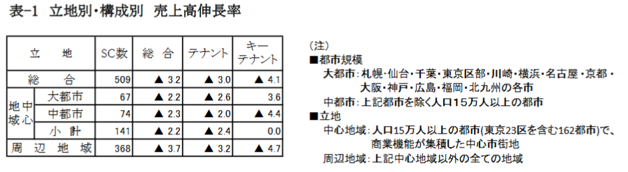 立地別・構成別を見ると、大都市のキーテナントが唯一3.6%でプラス。駅近くの施設が好調だった。他はすべてマイナスとなり、厳しい結果となった。