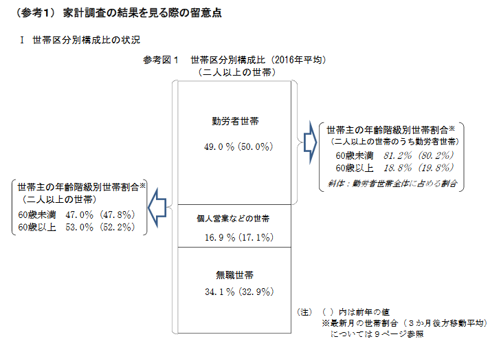 最後に世帯区分別構成比(2016年平均)を見てみると、2016年平均の勤労者世帯は49.0%。個人営業などの世帯は16.9%。無職世帯は34.1%(➞参考図1)。