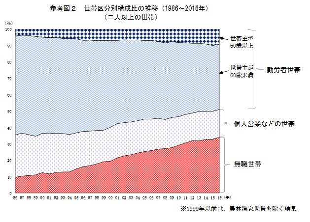 また1986年~2016年の構成比の推移を見ると、この30年間での割合の変化が良く分かる。勤労者世帯の割合は確実に減り続けている。そして減り続けている勤労者世帯の中でも60歳以上がじわじわ増え続けている。(➞参考図2)。