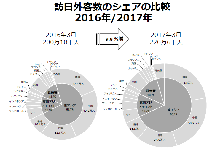 航空路線の新規就航・増便、クルーズ船寄港数の増加、これまでの継続的な訪日旅行プロモーションが効果をあげた。またイースター休暇が、昨年の3月末から今年は4月とズレたため、3月の欧米豪の訪日客は減っている。