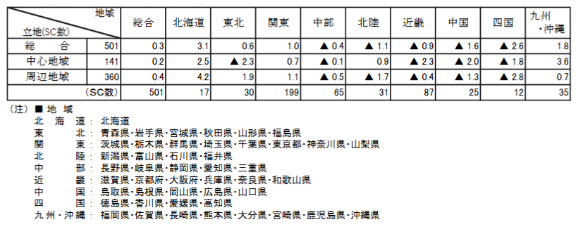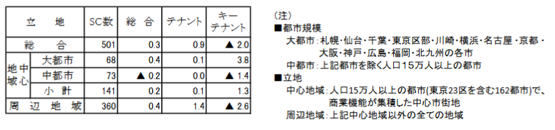 立地別・構成別の売上伸長率を見ると、総合では大都市、周辺都市がともに0.4%とプラス。中都市は▲0.2%だった。テナントをみると、大都市0.1%、周辺地域1.4%。中都市は±0.0%と横ばいだった。キーテナントは中都市▲1.4%、周辺地域▲2.6%だったが、大都市は3.8%と好調。駅近くの施設が売上げを伸ばした(表-1参照)。