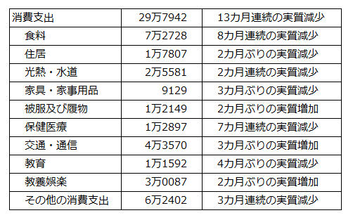 二人以上の世帯の消費支出は29万7942円。前年同月比は実質▲1.3%で13カ月連続減少。名目は▲1.0%。前月比(季節調整値)は▲2.0の減少だった。