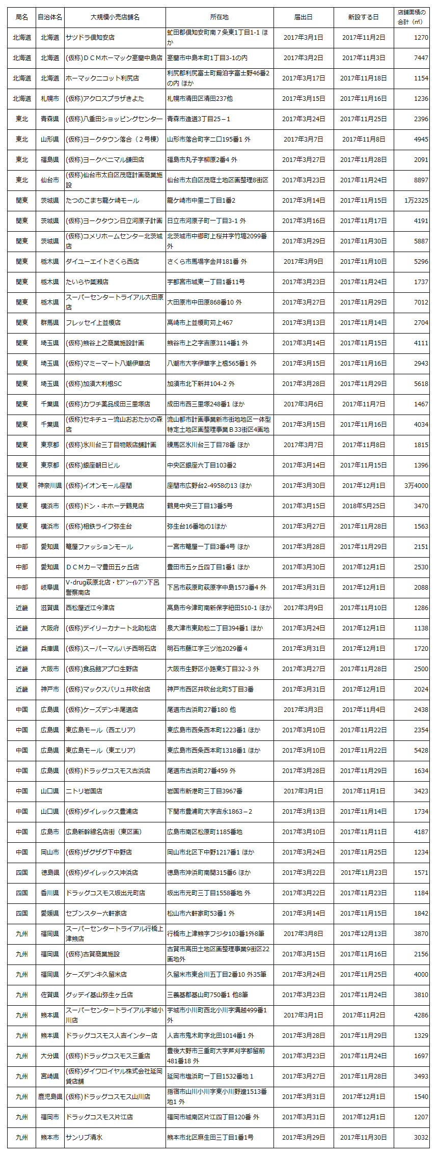 ⇒大規模小売店舗立地法(新設)届出の概要【2017年3月末】