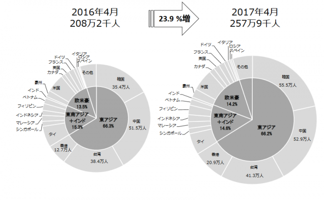 日本政府観光局(JNTO)から4月の訪日外客数が発表された。訪日外客数は257万9000人で、昨2016年4月の208万2000人を約49万上回り、23.9%の大幅な伸びとなった。単月としては、2016年7月の229万6000人を上回り、過去最高を記録した。