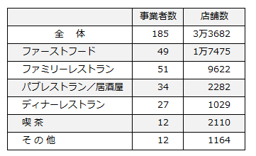 回答事業社数は185社、店舗数は3万3682店。表を見るとわかるように、ファストフードの全店舗数は1万7475店で全体の52%と半数を超える。これに9622店舗で28%を占めるファミリーレストランを合わせると、2業態で8割。この二つの業態の動向が外食産業の結果を左右する。