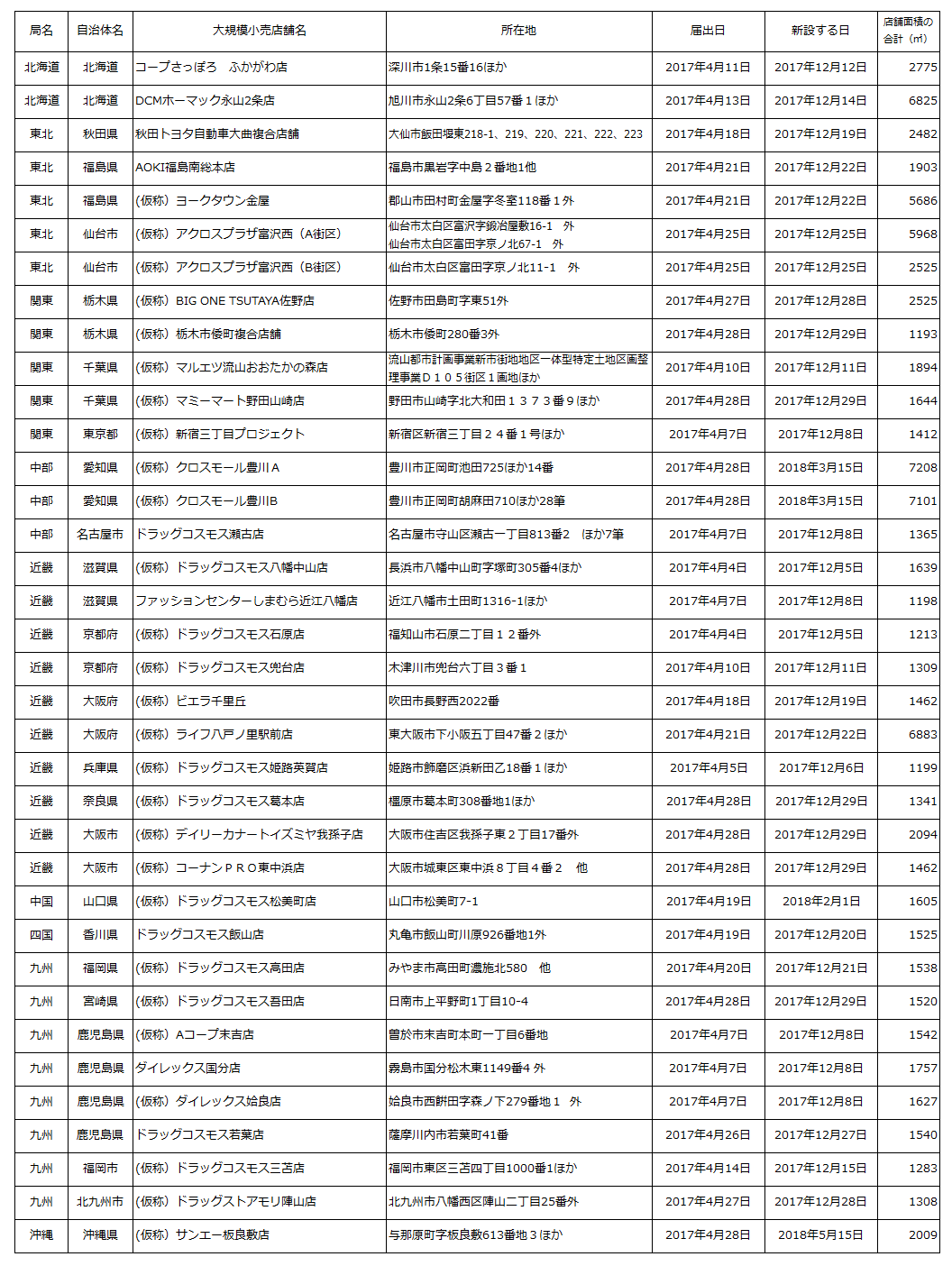 ⇒大規模小売店舗立地法(新設)届出の概要【2017年4月末】