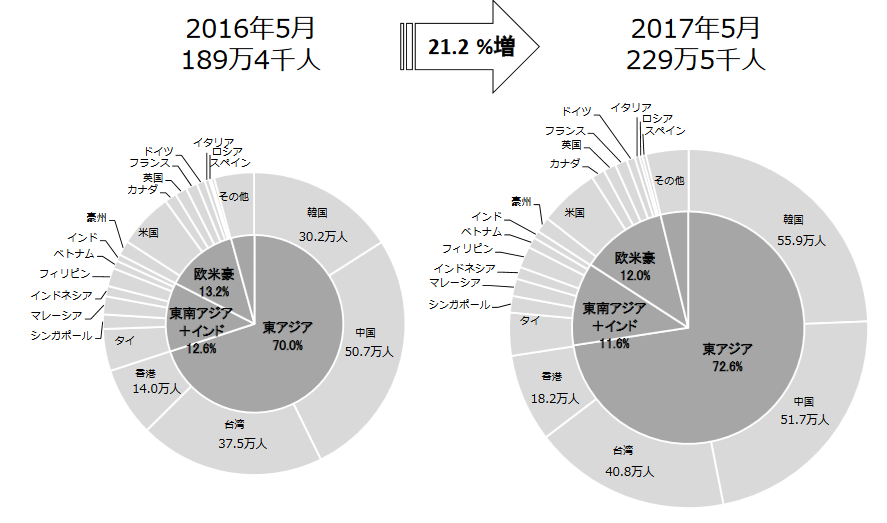 訪日外客数は229万5000人で、2016年5月比21.2%増。昨年の189万4000人を約40万1000人上回った。5月としては過去最高。2017年1月から5月までの累計は1141万1000人となり、過去最も早いペースで1000万人を超えた。