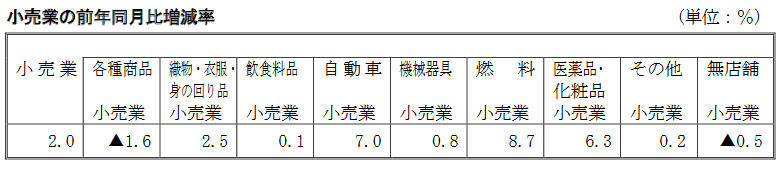小売業の販売額は11兆7590億円で+2.0%。季節調整済みでは▲1.6%。