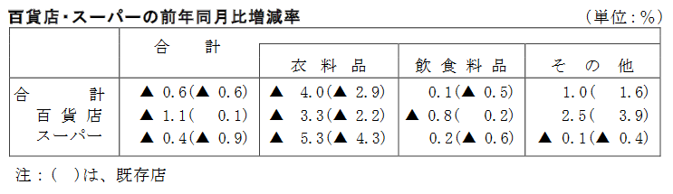 衣料品は▲5.3%(既存店▲4.3%)。その他▲8.1%、紳士服▲5.8%、婦人・子供服▲5.3%とすべてマイナス。