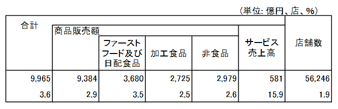 ファストフード及び日配食品+3.5%、加工食品+2.5%、非食品+2.6%とすべて好調。またサービスはプラス15.9%と大幅な伸び。
