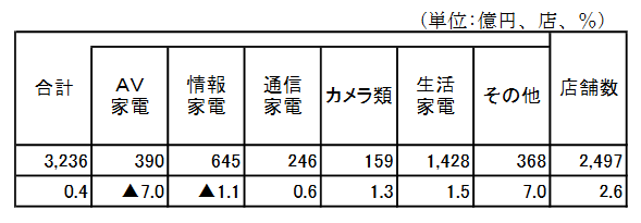 生活家電+1.5%、カメラ類+1.3%、通信家電が+0.6%、その他+7.0%の4項目がプラス。マイナスは2項目でAV家電▲7.0%、情報家電▲1.1%となった。