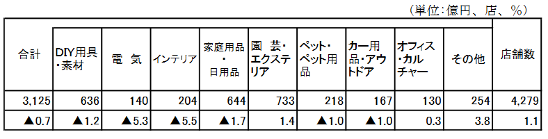 プラスは、園芸・エクステリア+1.4%、オフィス・カルチャー+0.3%、その他+3.8%。ほかはインテリア▲5.5%、電気▲5.3%など6項目がマイナスだった。