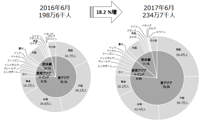 訪日外客数は234万7000人で、前年6月比18.2%増。2016年の198万6000人を約36万人上回り、6月としては過去最高を記録した。2017年1月から6月までの上半期の累計もまた過去最高の1375万7000人となった。