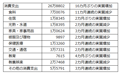 2人以上の世帯の消費支出は26万8802円。前年同月比は実質2.3%で16カ月ぶりの増加。名目は2.8%、前月比(季節調整値)は1.5%とすべてプラスとなった。