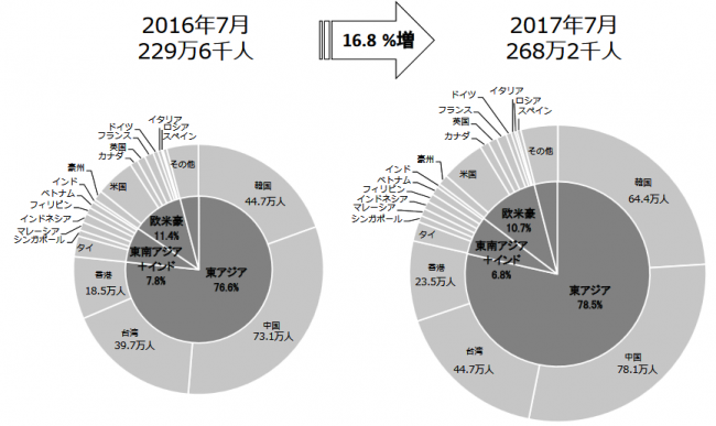 訪日外客数は268万2000人で、昨年7月対比16.8%増。2016年の229万6000人を約38万人上回り、すべての単月として過去最高を記録した。