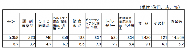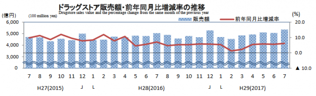 経済産業省発表の「商業動態統計速報」によれば、7月のドラッグストア販売額は5358億円、前年同月比6.2%プラスとなった。