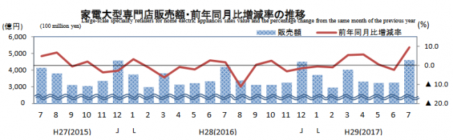 経済産業省発表の「商業動態統計速報」によれば7月の家電大型専門店販売額は、4595億円、前年同月比9.4%プラスとなった。