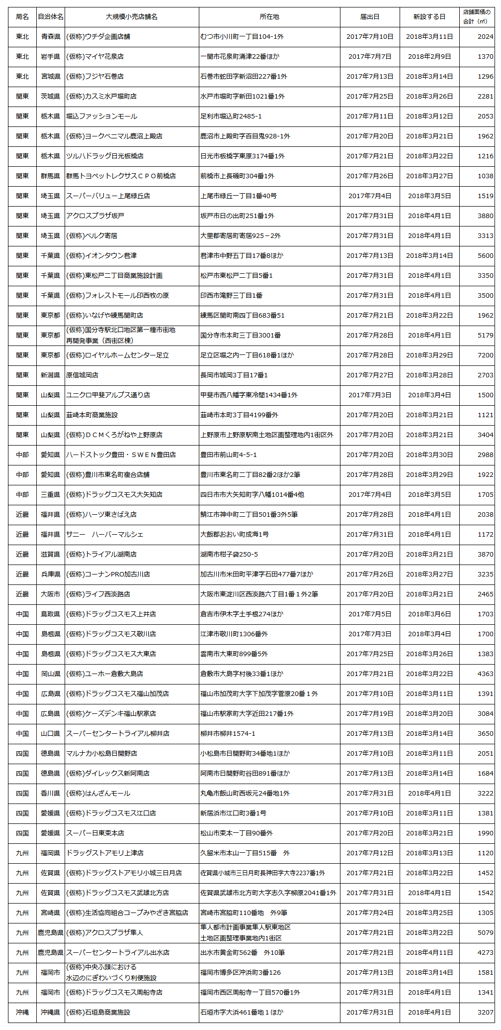 ⇒大規模小売店舗立地法(新設)届出の概要【2017年7月末】