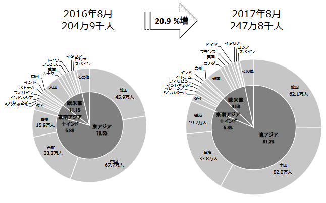 訪日外客数は247万8000人で、2016年8月の204万9000人を約42万人上回り、20.9%増。8月として過去最高を記録した。